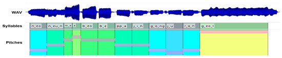 For speech–singing adaptation, we utilized the Children’s Song Dataset (CSD) corpus [35]. This corpus includes 50 songs sung by children in both Korean and English. These songs were professionally recorded by a female singer. Each song was recorded in two different keys, with variations from 3 to 5 semitones. This dataset is complemented by MIDI transcription files that include precise information about the onset and offset times of various elements in the songs. These MIDI files have been manually adjusted to accurately align with the corresponding syllable-level and phoneme-level lyrics annotations for training the melody predictor (Figure 2). The Korean part of this corpus consists of 100 recordings in total, collectively amounting to approximately 2.5 h of audio content. The duration of each individual audio file ranges from 17 to 190 s, with an average duration of approximately 90 s. All audio files in this corpus share a common sampling rate of 44.1 kHz.
