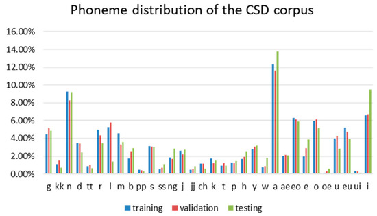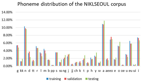 The model’s target is a phoneme sequence, not a word sequence or grapheme sequence. However, in the case of the NIKLSEOUL corpus, annotations are written in graphemes, rather than phonemes that reflect real pronunciation. We, therefore, employed a grapheme-to-phoneme (G2P) tool [36] called g2pK to convert annotations into phoneme sequences that were consistent with the Korean standard pronunciation. g2pK strictly annotates phonemes based on the Revised Romanization (RR) of the Korean system [37]. In contrast, the annotations in the CSD corpus are in phonemes, but are not exactly consistent with the RR system style notation. The CSD corpus treats diphthongs (except ui/i/and oe/oe/) as a combination of two vowel phonemes, instead of a single independent vowel in the g2pK. We, therefore, manually unified the annotations into the CSD-style notation, and standardized the sampling rate to 16 KHz. We have 32 phoneme classes following the CSD-style notation, where we added a space symbol to distinguish syllables. We superadded a blank symbol for CTC loss so that we had 34 classes for phoneme recognition. The pitch range of the CSD corpus was F3−F5, which was 26 classes. We also added a symbol for silence or unknown pitches, so we had 27 classes for melodic supervision.