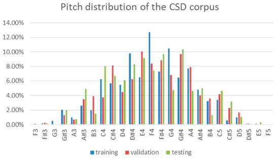Figure 5, Figure 6 and Figure 7 show the phoneme and pitch distribution on these training, validation, and testing datasets, respectively. The distributions of the datasets are similar to one another, which implies that the datasets were adequately divided into training, validation, and testing.