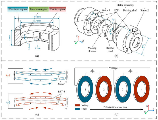 The proposed ILUM-D consists of four PZTs and electrodes, two stators with the same structure, a driving shaft, and the moving element, as illustrated in Figure 1b. The ring-shaped PZTs are attached to the inner and outer surfaces of the stators with identical polarization directions. The utilization of ring-shaped PZTs avoids a maximum strain region in the stator, which prevents the PZTs from fragmenting at high voltages. On account of the technical requirements of the vibration mode and the installation process, the stator is divided into the excite region, isolation region, and constrain region, as shown in Figure 1a. The symmetrical structure of the motor allows for easy installation and commissioning, which ensures that the driving shaft is positioned horizontally and vertically on the stator surface. The cylindrical driving shaft is fixed between the stators and transfers the axial displacement generated by the stators to the moving element; hence, the resonant frequency of the driving shaft should be verified to avoid the proposed ILUM-D working frequency.