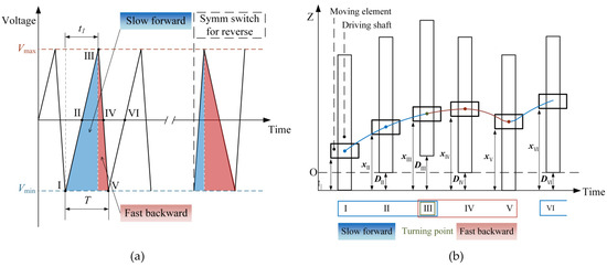 Schematics and motion principle of the proposed ILUM-D: (a) applied sawtooth wave signal and the signal for reverse motion; (b) motion principle of the ILUM-D.