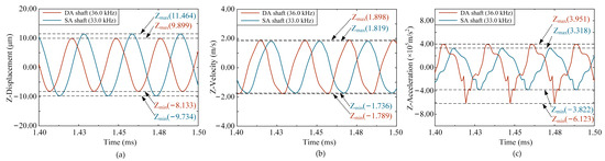 For further acquisition of the stator assembly vibration characteristics, dynamic simulations were conducted in ADINA based on the results of the modal analyses. It should be noted here that the transient analyses in this paper were conducted under fixed boundary conditions. The parameters of the voltage signal applied to the SA were set as 33 kHz and 500 Vp-p, and the parameters of the voltage signal applied to the DA were set as 36 kHz and 500 Vp-p. The Z-displacement and Z-acceleration of the driving shaft under the sawtooth wave signal with 500 Vp-p applied voltage were obtained. As shown in Figure 4, a significant divergence exists between the minimum and maximum vibration amplitudes of the driving shaft due to an asymmetrical excite signal. Though the motion range of the DA shaft is narrower than the SA shaft, as shown in Figure 4a, the velocity and acceleration range of the DA shaft is wider than the SA shaft, which indicates that the double-stator structure is capable of higher carrying abilities, as shown in Figure 4b,c.