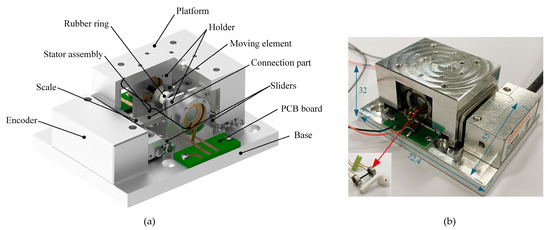 For experimental measurements, the experimental platform was designed as shown in Figure 7a, consisting of the stator assembly, moving element, rubber ring, scale encoder, holder, and the transmission and circuit components. The prototype with the transmission platform was fabricated as shown in Figure 7b while vibration and mechanical characteristic measurements were conducted to verify the finite element analyses results. Figure 8a and Figure 9a show the experimental system. The applied signal was supplied by a digital function generator (AFG 3022B; Tektronix Inc., Beaverton, OR, USA) and amplified by power amplifiers (HFVA-64; Foneng Technology Co., Ltd., Shenzhen, China).