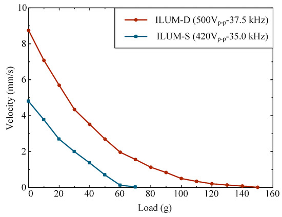 The plot of the output velocity versus the carrying load is shown in Figure 12. The output velocities of the ILUM-S and the ILUM-D were measured under the optimal frequency and voltage amplitude which were obtained in the previous measurements. The maximum carrying load of the ILUM-D is around twice that of the ILUM-S, which shows that the double-stator structure can effectively improve the output performance of the motor under the same preload and optimal frequency and voltage driving conditions.