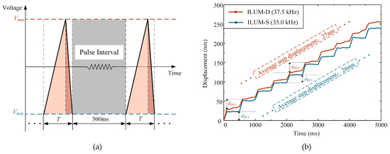 Furthermore, the step response characteristics of the motors were investigated. In the resolution measurements, a pulse sawtooth wave voltage signal with a pulse interval of 500 ms was used, as shown in Figure 13a, for more intuitive processing and summarization of the data. The displacement plots versus the time are shown in Figure 13b, from which the output displacement in each of the 10 pulse cycles is compared. The maximum displacement in a single pulse cycle is representative of the resolution that the motor can achieve. In this way, the displacement resolution of 26 nm for the ILUM-S and of 27 nm for the ILUM-D can be achieved under a pulse sawtooth wave signal when the amplitude of the applied voltage is 300 Vp-p.