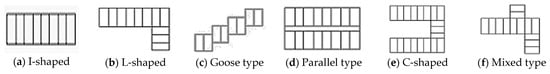 Wu (2011) studied the types of building lot layouts and classified them into six categories: I-shaped, L-shaped, Goose type, Parallel type, C-shaped, and Mixed type, as shown in Figure 1. The l-shaped configuration accounts for 86% [10]. Figure 1 illustrates that regardless of the unit type, townhouses predominantly feature middle units, except for the end and corner units. These middle units have a common wall on both sides, with natural light coming only from the front and rear. Furthermore, the layout of these units is significantly influenced by the parking space, entrance orientation, and stair placement, resulting in a unique layout pattern for the townhouse spatial area.