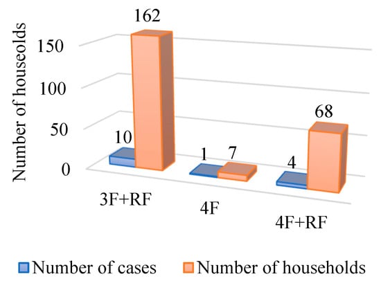 In Taiwan, common row townhouses are generally designed with three to four floors, and their floor plans typically exhibit a rectangular shape with a narrow width and long depth. A three-story building is represented as 3F, and a four-story building is represented as 4F. If an additional floor is added above the three-story (3F) or four-story (4F) structure, it is labeled as a ‘staircase space’ and designated as the roof floor (RF); these townhouses are primarily used for residential purposes. This study has categorized the floor types into three configurations: 3F+RF, 4F, and 4F+RF. Among these, there are 10 architectural cases of 3F+RF with a total of 162 units, 1 architectural case of 4F with 7 units, and 4 architectural cases of 4F+RF with 68 units. In total, there are 14 projects with 15 different floor plans and 237 units. The 3F+RF configuration accounts for 68% of the cases, followed by the 4F+RF configuration at 29% and the 4F configuration at 3%.