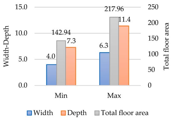 The minimum and maximum values for the building width, depth, and total floor area were shown in Figure 3. The minimum width is 4.0 m, and the maximum width is 6.3 m; the minimum depth is 7.3 m, and the maximum depth is 11.4 m; and the minimum total floor area is 142.94 m2, and the maximum total floor area is 217.96 m2. Consequently, the width of terraced townhouses ranges between 4.0 and 6.3 m, the depth ranges from 7.3 to 11.4 m, and the total floor area varies between 142.94 and 217.96 m2.