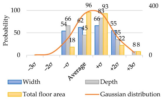 The normal distribution of building cases for the width, depth, and total floor area is illustrated in Figure 4. It shows that the majority of values for the width, depth, and total floor area fall within the range of the mean () plus or minus one standard deviation (±σ) and up to two standard deviations (+2σ), i.e., ( ± σ) and ( + 2σ). It is evident that the values for the width, depth, and total floor area do not appear within the range of the mean minus two standard deviations ( − 2σ). Most of the observed values are located to the right of the mean, and the distribution exhibits left skewness, indicating a negative skewness.