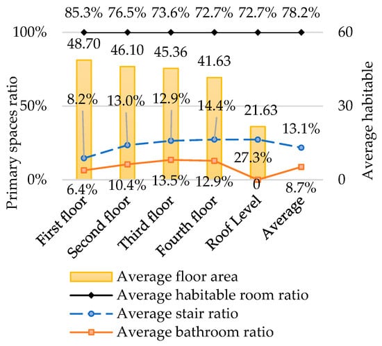 - The primary internal space allocations within a building are as follows: habitable room areas account for 78%, stairs constitute 13.1%, and bathrooms represent 8.7%. Both the total area of habitable room spaces and bathrooms increase with the expansion of the total floor area, while the total area of stairs remains constant.