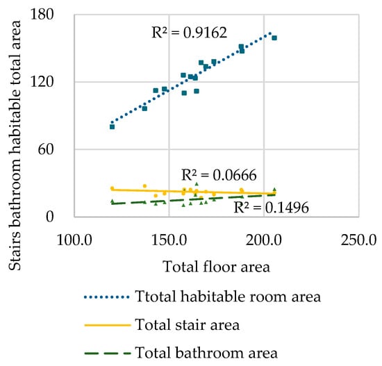 As shown in Figure 8, the coefficient of determination (R2) between the total habitable room area and the total floor area is 0.9162, which is greater than 0.5. Additionally, Table 3 shows a correlation coefficient (r) of 0.96 between the total habitable room area and the total floor area, indicating a strong positive linear relationship between the two variables. This means that the total habitable room area increases with the total floor area. The reason for this is that in the real estate market, when projects with a high total floor area (such as luxury houses) are introduced, the bathroom area also increases. However, the primary selling point is the increase in the total habitable room area, which provides more space for daily activities and living comfort.