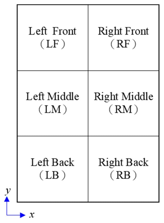 The planning of the staircase location and type significantly affects the size and layout of habitable rooms and bathrooms in townhouses. The schematic diagram of the ground floor layout for a townhouse, as shown in Figure 9, divides the building’s width (x-direction) into left and right sides and its depth (y-direction) into front, middle, and rear sections when facing the road from inside the house. Consequently, the single-story floor plan is divided into six zones: left front (LF), right front (RF), left middle (LM), right middle (RM), left rear (LB), and right rear (RB). The location of the staircase on each floor is calculated accordingly, and if there is an intermediate landing, its position is counted twice.