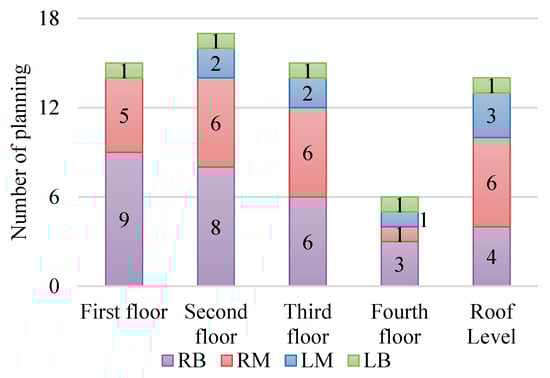 The positions of each floor in the case studies are shown in Figure 10. Regardless of the floor level, the highest proportion of staircase planning occurs at the rear-right (RB) position. This is especially evident on the first floor, where the number of cases with staircases planned at the rear-right (RB) position is the highest. This phenomenon can be attributed to Taiwanese customs, where the main entrance is traditionally placed on the left side (the “dragon side”), resulting in the main circulation path being on the left. Thus, positioning the staircase on the right side optimizes space. It is common for townhouses to have parking spaces on the first floor, requiring a deeper layout to accommodate vehicles, which pushes the staircase position to the rear.