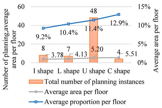 The frequency of the planning, area, and proportion of each staircase shape are shown in Figure 11. The average area and average proportion of the various shapes of staircases, ranked from lowest to highest, are as follows: I-shape staircases with 3.78 m2 and 9.2%, L-shape staircases with 4.13 m2 and 10.4%, U-shape staircases with 5.20 m2 and 11.4%, and C-shape staircases with 5.51 m2 and 12.9%. The frequency of planning, from highest to lowest, is as follows: U-shape staircases 48 times, I-shape staircases 8 times, L-shape staircases 7 times, and C-shape staircases 4 times. This indicates that I-shape staircases have the smallest average area and proportion, while C-shape staircases have the largest average area and proportion. U-shape staircases are the most frequently planned, with 48 instances, indicating that U-shape is the most commonly used.