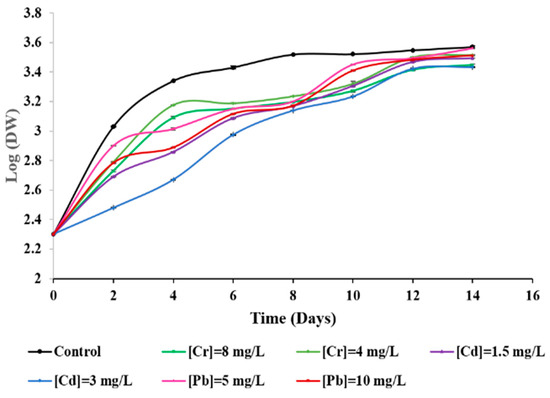 The growth of C. dorsiventrale was assessed under chosen metal concentrations. The daily tracking of dry matter concentration (DW) was carried out as previously described [35]. Briefly, cells were harvested by centrifugation at 4000× g for 10 min, washed twice with sterile distilled water and oven-dried at 105 °C until obtaining constant weight. The growth curves were established by plotting the relationship between daily dried biomass concentrations on a logarithmic scale and cultivation time. Growth rates (μ) were calculated as previously reported by Jiang et al. [36] and Rugnini et al. [37]. All experiments were executed in duplicate and data were expressed as mean values.