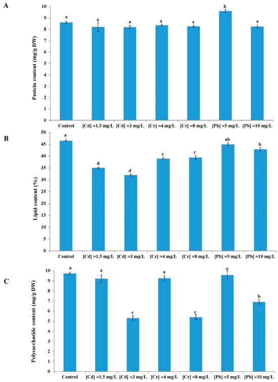 Effect of Cd, Cr and Pb single metal ion exposure on soluble-protein content (A), lipids content (B) and polysaccharides content (C) in C. dorsiventrale after 14 days of exposure. Data are means ± SE. Columns labeled with different lower-case letters indicate statistically significant differences (p < 0.05, ANOVA, Tukey’s multiple comparison test).