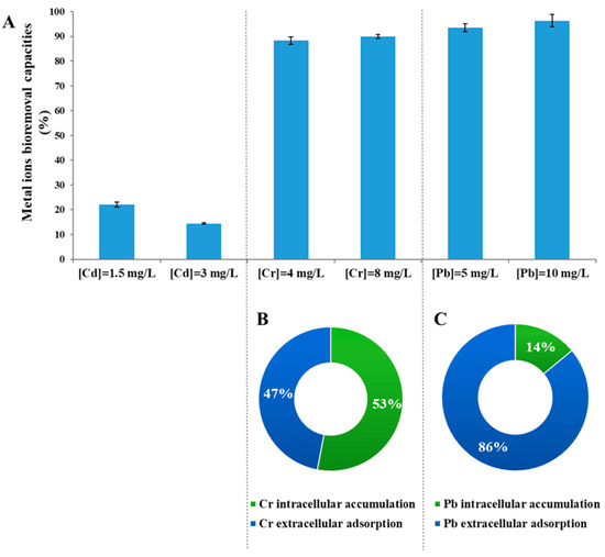 For Cd, removal efficiency did not exceed 22%, whereas those observed for both Cr (89%) and Pb (95%) were much higher. We therefore investigated Cr and Pb uptake mechanisms through measuring intracellular and extracellular ion accumulation (Figure 4B,C). The results showed that C. dorsiventrale removed around 89% of Cr, of which 53% were accumulated intracellularly and 47% were adsorbed on the cell surface. An even higher percentage (nearly 95%) was quoted for Pb with 86% adsorbed at the microalgae cell surface.
