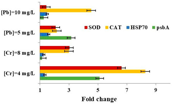 The results showed a significant increase in the expression of the catalase coding gene after exposure to Pb and especially to Cr, with an eightfold increase. An overexpression of the superoxide dismutase-coding gene was also observed. The expression of the psbA gene increased fivefold at 4 mg/L of Cr and threefold at 5 mg/L of Pb. A non-significant increase in the expression of the HSP70 coding gene was observed under Cr exposure, whereas a slight overexpression was noted with Pb treatment.