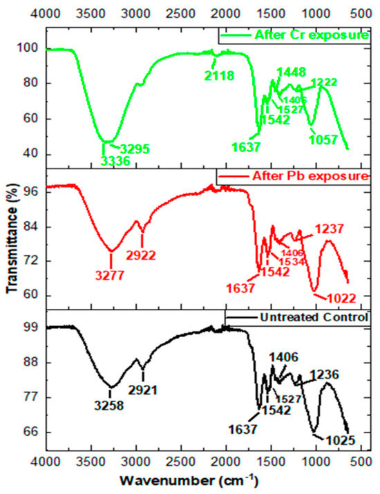 The obtained spectra of C. dorsiventrale biomass after exposure to Cr and Pb revealed changes in functional groups (hydroxyl, carboxyl, phosphate, amino, sulfate, etc.) compared to the control. Those changes were represented by different peaks mainly characteristic of lipids, polysaccharides, and proteins. Shifts in many groups’ positions were observed after treatments with Pb and especially with Cr (Table 3).
