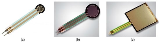 Force-resistive sensors, or force-sensitive resistors (FSRs), are electronic devices designed to detect and measure the force or pressure applied by changing their electrical resistance in response to the applied force. These are mainly constructed using substances that demonstrate a variation in electrical resistance; mechanical distortion is applied. The electrical resistance of the sensor is inversely proportional to the force applied, thus providing a continuous or analog output signal that corresponds to the force exerted on them. These analog output signals can be converted into digital values using analog-to-digital converters (ADCs) for further processing and analysis by microcontrollers or other electronic devices. Force-resistive sensors are simple, low-cost, and flexible but limited in accuracy, durability, and sensitivity to environmental factors such as temperature and humidity. Figure 2 shows the FSR 400, FSR 402, and FSR 406 models from Interlink with two wires.