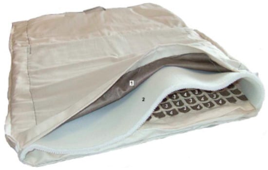 The textile pressure sensor is a type of sensor embedded into cloth or textile materials to detect and quantify pressure or force applied to the surface. The most common measurement principle for textile moisture sensors is a resistance measurement between two conductive electrodes. Polyester, cotton, or polypropylene are examples of insulating materials used to make the support cloth over which the electrodes are constructed. The fabric has relatively little electrical conductivity when it is “dry”. Ma et al. [] employed 12 such sensors situated on the bottom rest and backrest of a chair. They applied decision trees, SVM, multilayer perceptron, naïve Bayes, and k-NN algorithms to categorize five distinct sitting postures specific to wheelchairs. The study yielded a high accuracy rate of 99.51% with decision trees. Nevertheless, their approach utilized a greater number of sensors compared to our study and focused solely on detecting five wheelchair-specific postures. Meyer et al. [] optimized the textile pressure sensor for low hysteresis and used it for classifying different sitting positions in chairs with an average recognition rate of 82%. The naïve Bayes classifier was used to classify the data of nine subjects. The textile sensor array of 240 elements was embedded in a cushion as shown in Figure 3 (1: common electrode, 2: spacer, 3: sensing electrodes, and 4: electrodes switched to ground).