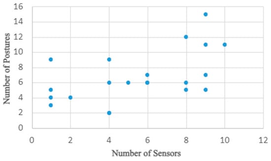 The number of postures recognized using sensor approaches varies from 4 to 15: 4 [,,,], 5 [,], 6 [,,,,,,], 7 [,], 8 [,], 9 [], 10 [], 11 [], 12 [], and 15 [] as depicted in Figure 5, which reveals that there is no straightforward relationship where an increment in the number of sensors consistently results in the recognition of a greater number of postures. Some studies with fewer sensors have successfully recognized many postures, while others with more sensors have identified fewer postures. The effectiveness of posture recognition often depends more on factors such as the tactical positioning of sensors, the quality of data collected, and the sophistication of the data processing and machine learning algorithms used. For example, a well-placed set of a few high-quality sensors can sometimes outperform a larger array of less optimally placed sensors.