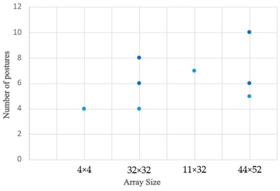 In the case of array configurations, as shown in Figure 6, higher resolution in pressure sensor arrays significantly enhances the ability to recognize a greater number of postures. Higher-resolution arrays consist of more sensors per unit area, providing finer granularity in the pressure data. This increased detail allows for more precise detection and differentiation of subtle changes in pressure distribution, which is crucial for accurately identifying various postures.