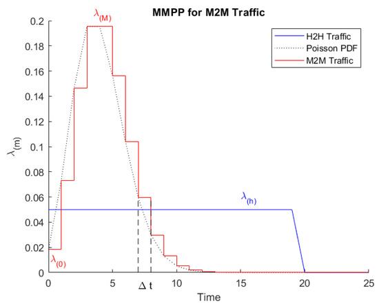 In Figure 2, an MMPP model is used as a framework to accurately model M2M traffic sources by analyzing an event when a huge number of M2M devices behave in a synchronized manner [26,27]. For H2H traffic, our MMPP model has a constant average arrival rate λ(h). As for M2M traffic, it has a variable Poisson process-modulated rate λ(m); 0 ≤ m ≤ M.
