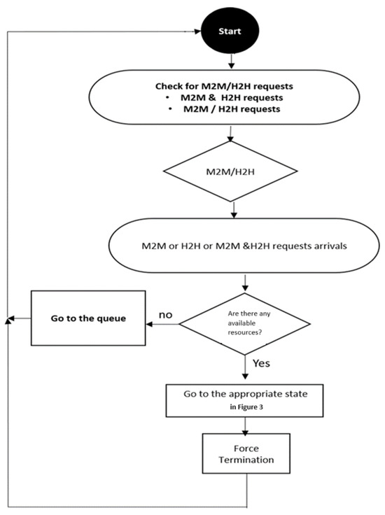 A single uplink cell in an eNodeB with total network resource blocks (c) is represented by CHANAL. M2M and H2H traffic are examples of heterogeneous traffic types. According to Poisson’s distributions, both types of traffic are expected to have arrival rates of λ(m) and λ(h), respectively [20]. Consider that the exponential distributions for M2M and H2H service rates, respectively, are represented by μ(m) and μ(h). Resource Allocation Control (RAC) is another feature of CHANAL that is utilized to manage, control, and grant access to network requests in accordance with the resources that are available. In network congestions brought on by catastrophic occurrences, RAC is essential because it adaptively manages resources to manage the overwhelming demands of M2M devices while limiting H2H requests to reasonable levels.