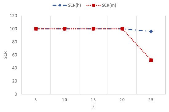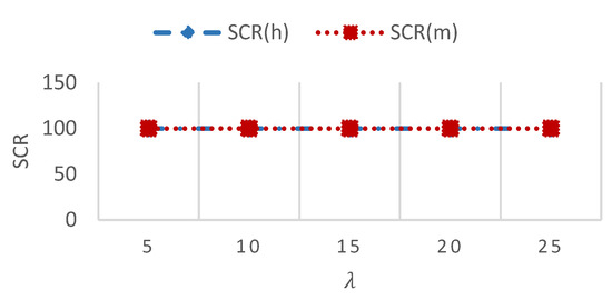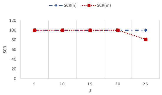 Since the network allocates the majority of its resources to H2H traffic (rb(h) = 94), there are no restrictions on H2H traffic, knowing that the average number of requests per time interval is 25 (λ(h) = 25) with scr(h) = 100% and ru(h) = 26.5%.