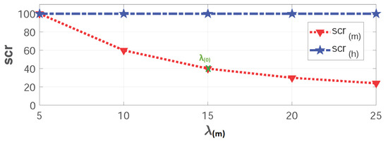 For H2H traffic, there is just one issue in the “worst-case scenario” when the completion rate decreases to 56% (scr(h) = 56%), since the system reserves 72 resource blocks for M2M traffic, which satisfies 96% of M2M requests.