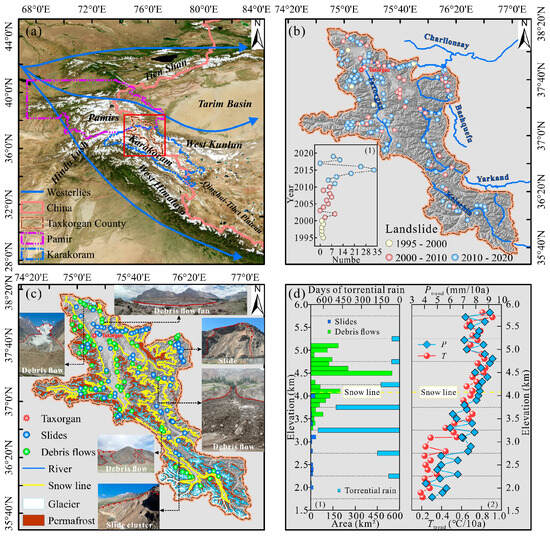 After reviewing the literature, five bellwether sites were selected around the world where landslide activities are most sensitive to climate change and long-term, systematic observations could be obtained: Fairweather Range, North America; Northern Patagonia Icefield, South America; European Alps, Europe; Karakoram, Asia; and Aoraki/Mount Cook, Oceania [38]. In this study, we used Taxkorgan County, which is located in the eastern Pamir Plateau and the Karakoram, China, as the study area (Figure 1a) to study landslide susceptibility. This area is characterized by sparse vegetation [39], and extensive glaciers and permafrost (Figure 1c). These provide favorable conditions for landslides. In Taxkorgan County, from 2000 to 2019, there were a total of 258 landslides (138 slides and 120 debris flows) with areas greater than or equal to 0.5 km2 (Figure 1b), which were identified using historical archives, visual interpretations of Google Earth satellite images, optical image contrast, and field investigations. Overall, 90% of the large-sized debris flows induced by snow melting, glacier retreating, and freeze-thawing resulting from rising temperatures were concentrated in the area above the snow line, which is covered by glaciers and permafrost all year round (Figure 1c,d). In contrast, the small-sized slides (73.2%) were widespread in the region below the snow line and were triggered by rainfall [6].
