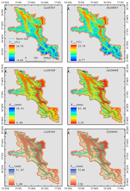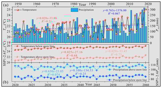 In climate scenario SSP1-2.6, the climate in the region continues to become warmer and wetter before 2060, exhibiting a positive warming rate and increasing precipitation trend (Figure 2b). Notably, the future rate of change in the temperature above the snow line (0.29 °C/decade) is slightly higher than the past rate of change (0.28 °C/decade), while the future warming rate below the snow line (0.25 °C/decade) is lower than the past warming rate in this region. The precipitation above the snow line in the region is greater than that below the snow line. However, compared to the trend of the maximum precipitation in this region in the past (7.63 mm/decade), the precipitation in the region, especially below the snow line (1.08 mm/decade), will decrease significantly in the future.