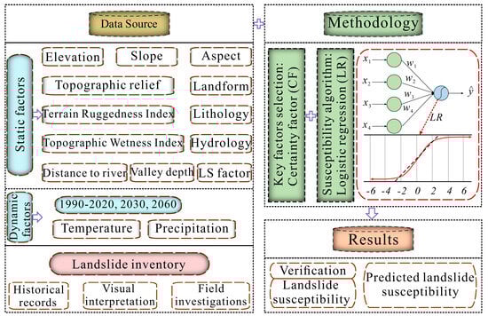 Identifying the primary factors that trigger landslides is crucial for assessing landslide susceptibility. However, there is currently a lack of standardized methodologies to determine these vital factors [41,42]. Our assessment framework for landslide susceptibility in Taxkorgan takes into account terrain, geomorphology, hydrology, climate change, and land use/cover, particularly sparse vegetation and low population density. We delineate fourteen potential landslide factors that are both static and dynamic: elevation, slope, topographic relief, aspect, Terrain Roughness Index (TRI), landform type, lithology, hydrogeology, LS factor, TWI, valley depth, distance to river, temperature, and precipitation (Figure 3). Initially, both static and dynamic factors were optimized; to achieve this, we applied the CF model and conducted susceptibility using the LR model to determine the key factors contributing to landslides. Subsequently, we calculated the spatial probability by generating a landslide map for 2020 with the LR model, which was validated using the area under the receiver operating characteristic (ROC) curve methodology. Finally, we employed a statistical downscaling model to project future climate variables (temperature, rainfall, and snowfall) under the SSP1-2.6 scenario based on the Coupled Model Intercomparison Project Phase 6 (CMIP6) dataset [43]. The LR model was also utilized to forecast the landslide susceptibility of the years 2030 and 2060. Figure 3 illustrates the methodological approach used in this study in a flowchart.