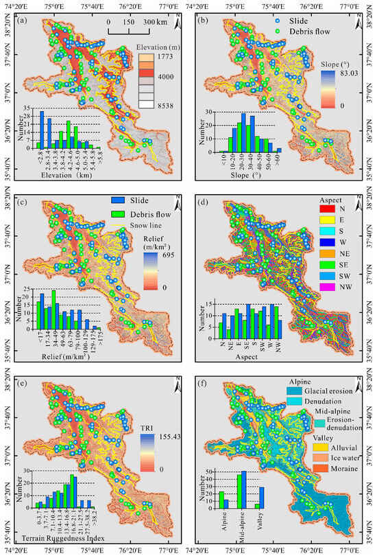 Topography is a causative factor of landslides and plays a controlling role in their occurrence. Elevation is a fundamental aspect of analyzing landslides. In Taxkorgan, 98% of slides occurred below the snow line (H < 3400 m), while 95.7% of debris flows occurred above the snow line (4200–5400 m) (Figure 4a). The slope affects the sedimentation and accumulation of loose debris. Steep slopes are more prone to landslides. Slides and debris flow mainly occurred on slopes ranging from 10 to 60° (Figure 4b). The potential energy of slides and debris flows is determined by their relative relief, which ranges from 0 to 695 m/km2 (Figure 4c). However, the slides and debris flows were primarily concentrated in locations with a relative relief of less than 100 m/km2. The aspect affects hydrological processes and meteorological events, which in turn result in landslides (Figure 4d). The TRI shows the degree of regional ground relief. Landslides in the study area tended to occur in high/mid-rough terrain, where the TRI ranged from 7.1 to 21.1 (Figure 4e). Taxkorgan, which crosses the Pamirs and the Karakorum, has a complex landform type, with landslides primarily occurring in glacial erosion and denudation landscapes, valleys, and moraines in the alpine and subalpine zones (Figure 4f).