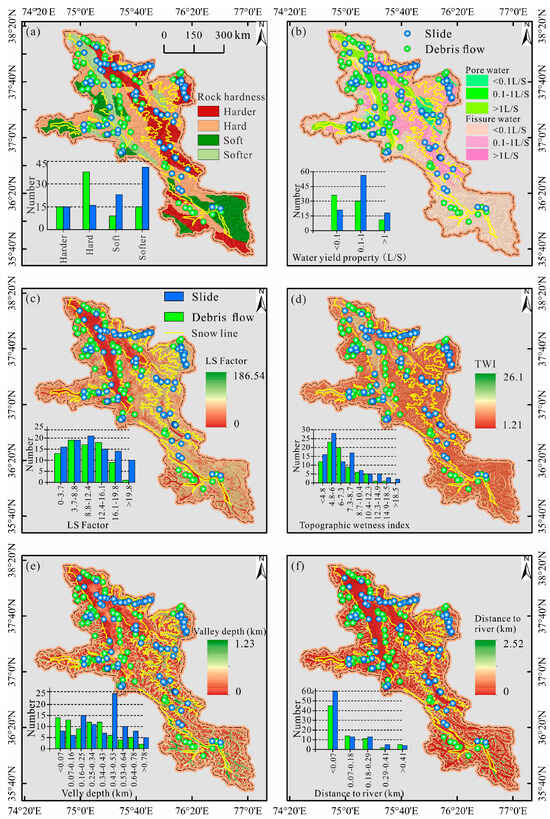 Lithology can reflect rock weathering and erosion while also influencing landforms. Figure 5a displays the distribution of rock hardness, revealing that slides were more distributed in softer rock regions and debris flows in hard rock. Figure 5b depicts the water yield property of Taxkorgan, which has a scarcity of groundwater, particularly fissure and pore water. Landslides were statistically more common in fissure water (water production of 1 L/s). The LS factor is an important element in estimating regional erosion. The TWI might reflect the soil’s moisture content. Larger valley depths may expand the slope area, providing materials and pathways for landslides. River erosion can destabilize hillsides, resulting in landslides. Landslides in the region are statistically dispersed in places with an LS factor of less than 19.8, a TWI of less than 14.9, valley depths ranging from 159.1 to 641.4 m, and river distances of less than 69.1 m (Figure 5c–f).