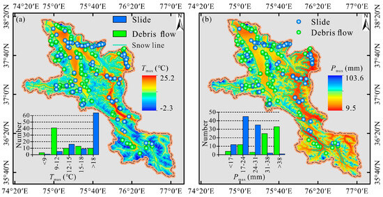 This study focused on landslides caused by climate change. According to prior research [5,6], the triggering factors for slides and debris flows were heavy rainfall and maximum temperature, respectively. Increasing maximum temperatures cause glaciers to retreat, snow to melt, and freeze–thaw, resulting in debris flows. Figure 6 depicts the region’s highest temperature and precipitation over the last 30 years. Figure 6a shows that the bulk of debris flows occurred above the snow line, where the temperature was lower and the snowfall was higher. The increased rainfall below the snow line has exacerbated the occurrence of slides, with a maximum rainfall of 30 mm at the snow line over the last 30 years (Figure 6b).