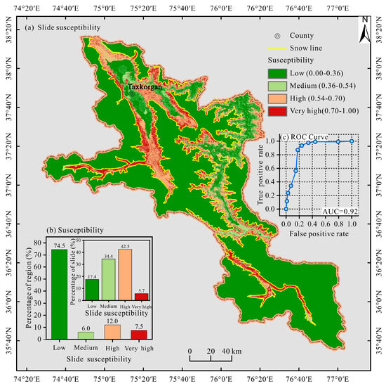 Figure 8 depicts the slide susceptibility. The study area was divided into four categories based on normalized values: low susceptibility (<0.36), medium susceptibility (0.36–0.54), high susceptibility (0.54–0.71), and extremely high susceptibility (>0.71) (Figure 8a). In total, 75.4% of the area has low slide susceptibility. Only 19.5% of the region was very susceptible to slides, which were all located below the snow line (Figure 8b). Statistically, 82.6% of the slides were distributed in areas with medium, high, and very high susceptibilities. The accuracy for the slide susceptibility was 0.92 (Figure 8c), which was estimated using the remaining 20% of slides.