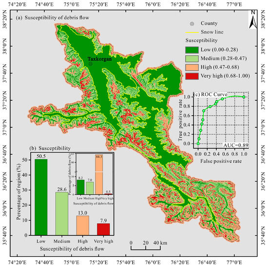 Figure 9 depicts the susceptibility of debris flows. According to the normalized susceptibility value, the study area was divided into four categories: low susceptibility (<0.28), medium susceptibility (0.28–0.47), high susceptibility (0.47–0.68), and very high susceptibility (>0.68) (Figure 9a). The low-susceptibility area of debris flows accounted for 79.1% of the study area. The high-susceptibility area accounted for 20.9%, which was all located above the snow line. Statistically, 84.8% of the debris flows were distributed in areas with high and very high susceptibility (Figure 9b). The accuracy for the debris flow susceptibility reached 0.92 (Figure 9c), verified by the remaining 20% of debris flows.