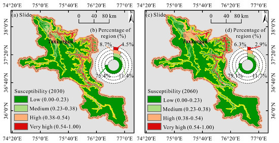 Predicted slide susceptibility. (a) Slide susceptibility in 2030. (b) The area proportion of each susceptibility grade in 2030. (c) Slide susceptibility in 2060. (d) The area proportion of each susceptibility grade in 2060.