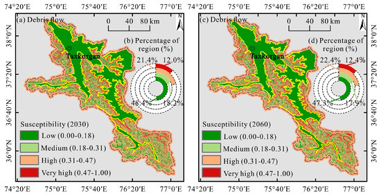 Predicted debris flow susceptibility. (a) Debris flow susceptibility in 2030. (b) The area proportion of each susceptibility grade in 2030. (c) Debris flow susceptibility in 2060. (d) The area proportion of each susceptibility grade in 2060.