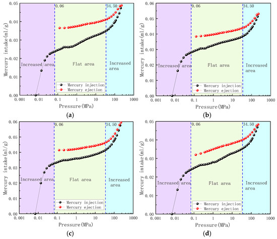 According to Figure 1, the mercury injection curves of the four coal samples have similar shapes, and the changes in the mercury injection curves exhibit three distinct conditions. When the mercury injection pressure reaches approximately 0.06 MPa, the amount of mercury injection increases sharply, and it first enters the macropores. When the pressure increases from 0.06 Mpa to approximately 34.50 Mpa, the curve changes relatively smoothly, and the coal continuously absorbs the kinetic energy of the injected mercury, whereas the liquid mercury further occupies relatively small pores. When the pressure exceeds 34.50 Mpa, the curve changes significantly again, the pore volume is further compressed, and liquid mercury enters smaller capillary pores. The mercury injection and removal curves do not overlap, and hysteresis is prominent due to the large and complex pore volume in coal. During the mercury injection stage, high-pressure liquid mercury can enter the open, semi-open, and partially closed pores, whereas, during the mercury removal stage, the liquid mercury enters the open and semi-open pores, with partially closed pores retaining some mercury. Figure 1a shows the mercury injection curve with a larger opening, faster changes in the mercury removal stage, better pore development, and the best connectivity.