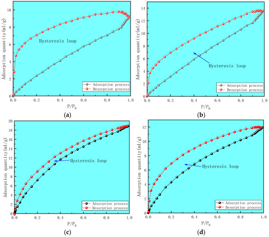 Adsorption–desorption curve of liquid nitrogen method. (a) XJE, (b) PML, (c) HYS, (d) LXK.