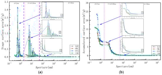 Table 2 and Figure 5 present the distribution of the specific surface area of the full pore size. As listed in Table 2, the specific surface area of each sample stage is mainly distributed in the microporous and mesoporous segments, with microporous segments accounting for 41.4061–66.8428%, mesoporous segments accounting for 32.4920–56.2841%, and microporous segments accounting for the lowest proportion of 0.6652–2.3098%. As shown in Figure 5a, the specific surface area curve of the micropores (d ≤ 2 nm) stage is widely distributed, and the peak frequency is high, with a maximum peak of 3.1336 m2/g. The specific surface area distribution during the mesoporous stage (2 < d ≤ 50 nm) is also relatively wide, with a maximum peak of 1.9819 m2/g. The distribution of specific surface area during the macroporous stage (d > 50 nm) is very small, with only two peaks, and the maximum peak is 0.0912 m2/g. Figure 5b shows that the curve within the microporous segment is the steepest, whereas the curves in the mesopore and macropore segments gradually become smoother as the pore size increases.