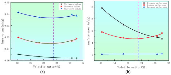 Relationship between volatile matter, pore volume, and specific surface area. (a) Pore volume, (b) surface area.