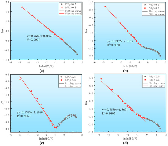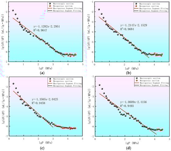 where is the adsorption capacity of liquid nitrogen, ; is the saturated vapor pressure of gas adsorption, ; C is the equilibrium pressure for liquid nitrogen adsorption; D is a constant; E is the slope of curve F; G is the fractal dimension, ranging from 2 to 3. The larger the value, the rougher the surface of the porous medium, and vice versa.