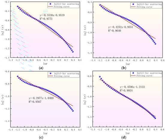 Fractal calculation of sponge models with different coal ranks. (a) XJE, (b) PML, (c) HYS, and (d) LXK.