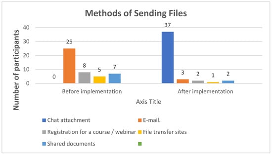 The proposed solution was implemented within the institution where one of the authors is employed, and the study presented in this paper was conducted on 45 users. Data collection was done through questionnaires with different questions sent and received by email and/or phone call. Data gathering was carried out over 30 days. Each participant received the questionnaires and had the responsibility to fill them in and send them on day 10, day 20, and day 30. After receiving the questionnaires in those intervals, the data were collected and centralized in a table. The 45 people from the chosen institution who participated in this study are aged between 22 and 30 years. The participants’ level of knowledge and use of e-learning platforms, chat sites, and videoconferencing programs are as follows: eight beginner level, 24 intermediate level, and 23 advanced level. Every person is familiar with sending messages via chat, email, and attachments through file transfer sites. All of them accessed an e-learning platform where they participated in tests, quizzes, and conferences on different topics. The e-learning platform is usually used for posting or sending information on the main page as well as the chat window. The study carried out on the 45 students was to identify which method they prefer to use to send attachments, and which seems to be the most effective and easy to use, as can be seen in Figure 1.
