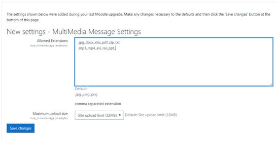 This settings page allows administrators to control or enter file types and maximum upload size for students in the chat window, as shown in Figure 5.