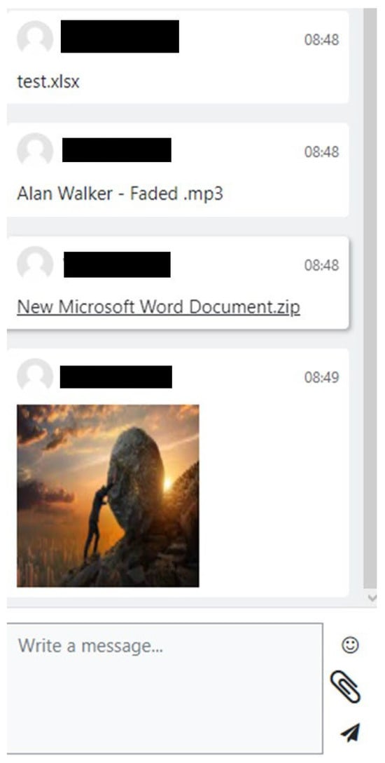 After all the settings have been made in the administration section, the platform will be restarted, and the new changes will be checked. If all changes have been made successfully, it will go to the chat window, where the file attachment icon will appear. To attach files, click on the icon, then select the desired document and execute the send command. Immediately in the chat window of student 1 who sent the document, the name of the file and its extension will appear, and student 2 will receive a warning message, as shown in Figure 6.